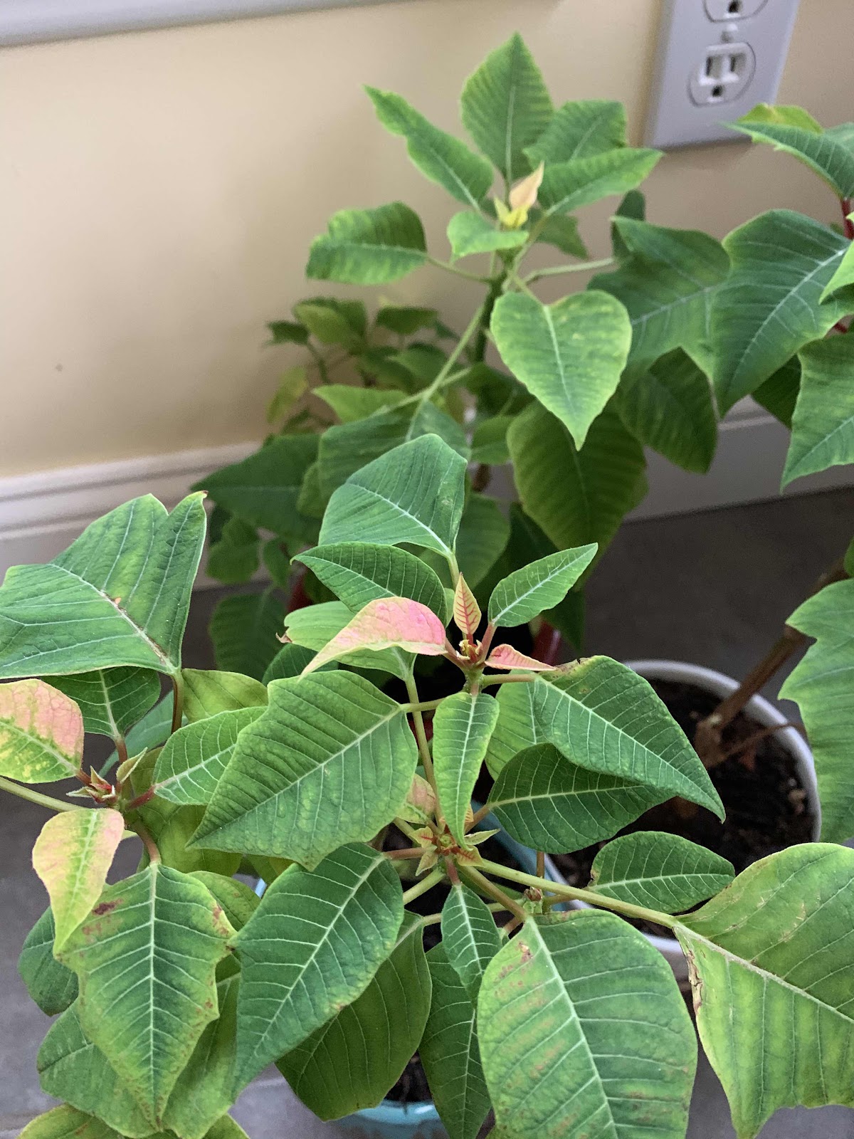 This is one of last year’s poinsettias, and by last year I mean Christmas 2019. Last winter it started in the inevitable decline of a tropical plant in Michigan in winter. I usually hang onto my Christmas poinsettias for a few months until it is too unbearable to watch it supper and decline any longer. Last winter, however, all three of my poinsettias started to grow back. I guess I kept them long enough to give them another chance at life. The unfortunate thing was that they were only growing green leaves. I did some research and learned that by limiting their light to 8 hours per day, they would start to regrow their colored leaves, the ones we all know and love and refer to as “flowers.” For the months of November and December (right up until Christmas), we religiously put a box on top of them at 3:00 every afternoon and then uncovered them at 7:00 am the next day. Nothing at all seemed to be happening, except for the occasion and unfortunate broken limb from boxing them hastily. Right before Christmas 2020, I called off the experiment. It just didn’t seem to be working since then, more and more, the color has been returning. We are still going to forgo the daily boxing, but we will continue to live them and cheer on their progress. Who knows, maybe they will still be around for Christmas 2021.